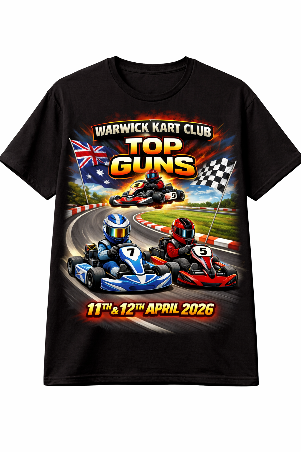 Designed to capture the speed, power and adrenaline of track racing, this bold full-colour print features high-impact kart action, iconic race flags, and striking TOP GUNS lettering — all set for maximum impact on black tees.
